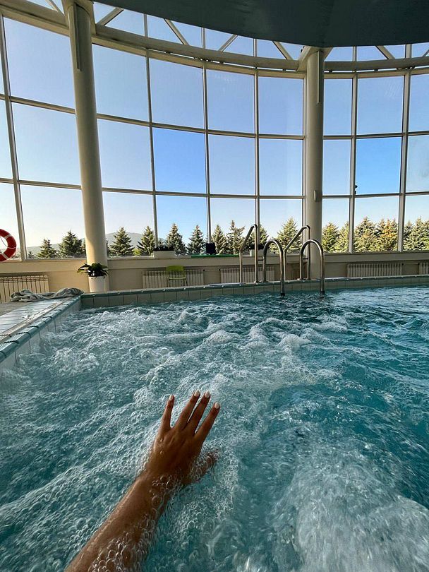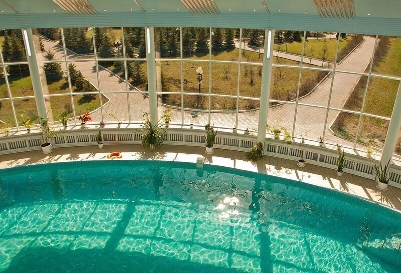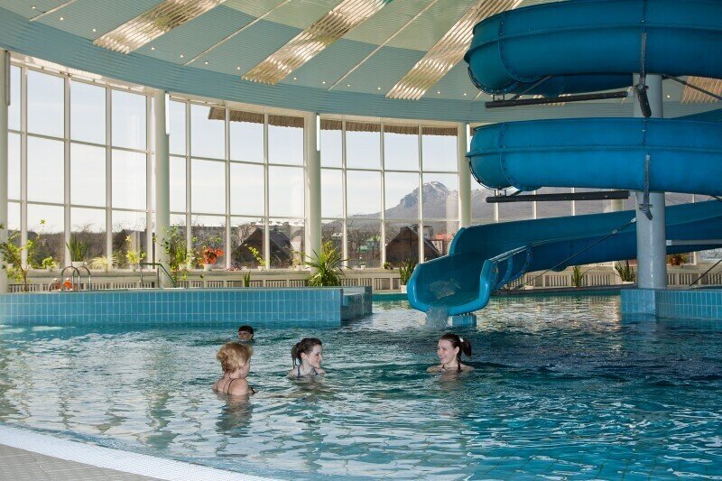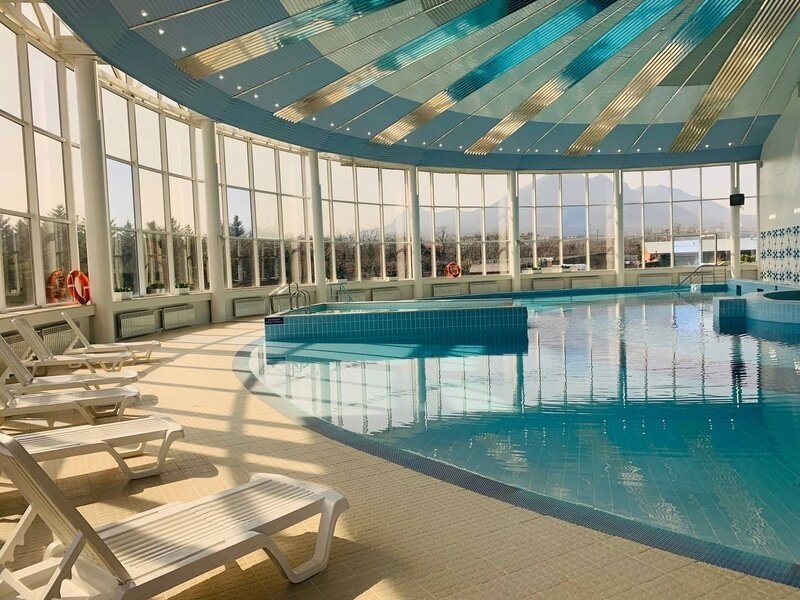 Большой плавательный бассейн в спорткомплексе, с горкой, джакузи и детской зоной.
